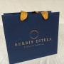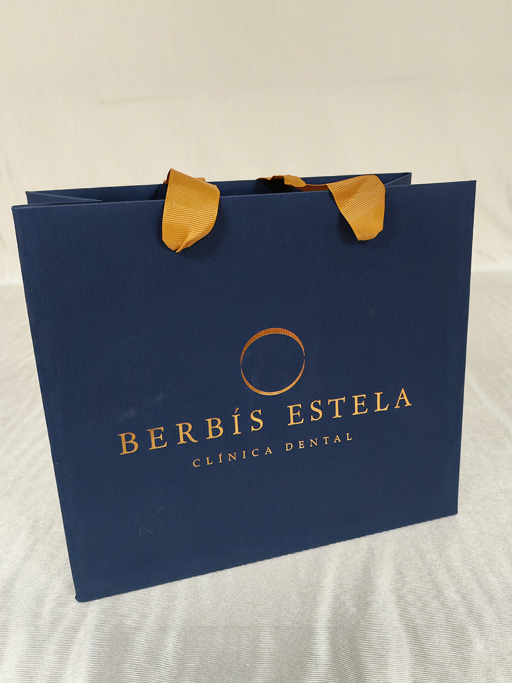 Bolsa de papel gofrado con asas de cinta de otoman. Impresión con stamping dorado oro viejo.