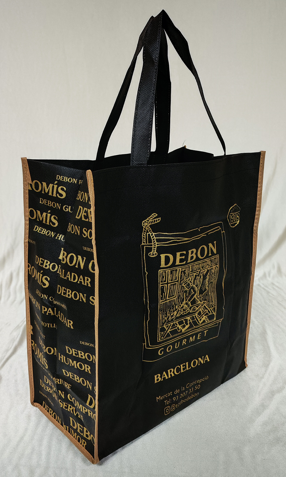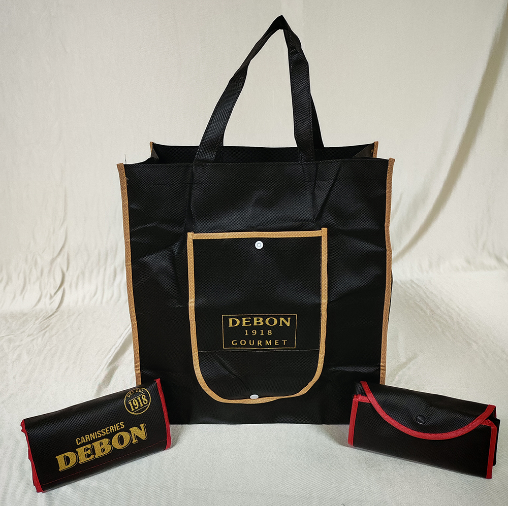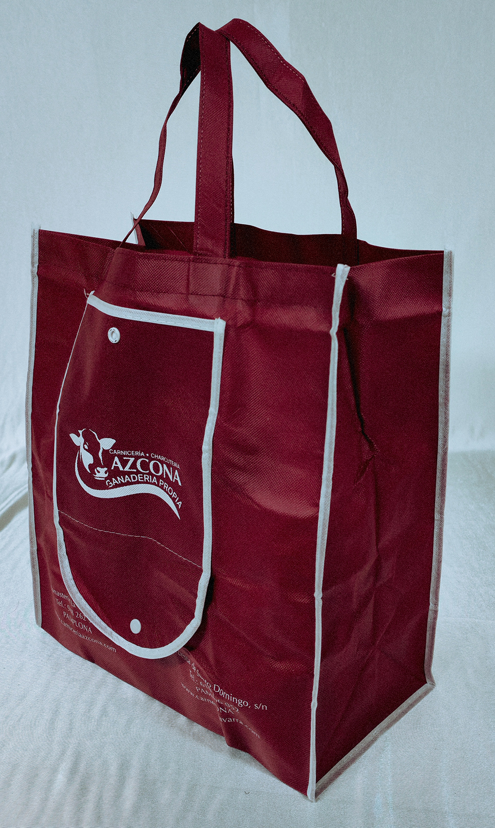Práctica bolsa de tela plegable con bolsillo. Gran capacidad para transportar la compra. Realizada con tejido no tejido de 80 gr. Impresa con serígrafía.