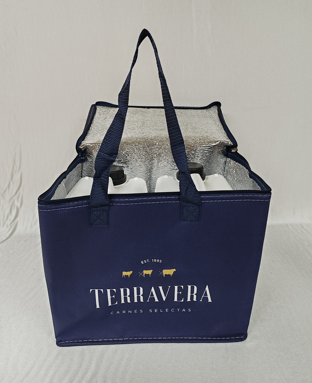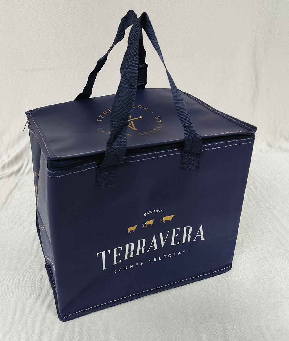 Bolsa de sintex con revestimiento interior térmico ideal para hacer la compra hasta llegar a casa. Tambien para un día de picnic o playa, ya que conserva el frescor durante horas. Totalmente personalizable. Medidas 34x27x28.